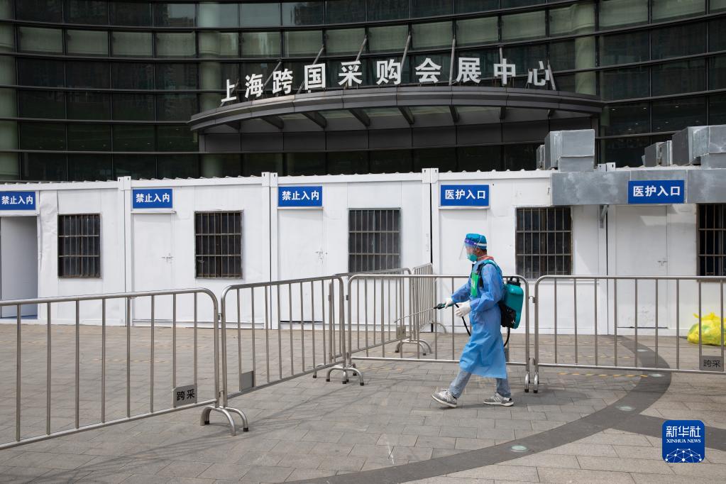 4月9日,在上??鐕少彆怪行姆脚撫t院,工作人員在做消殺處理。新華社記者 金立旺 攝