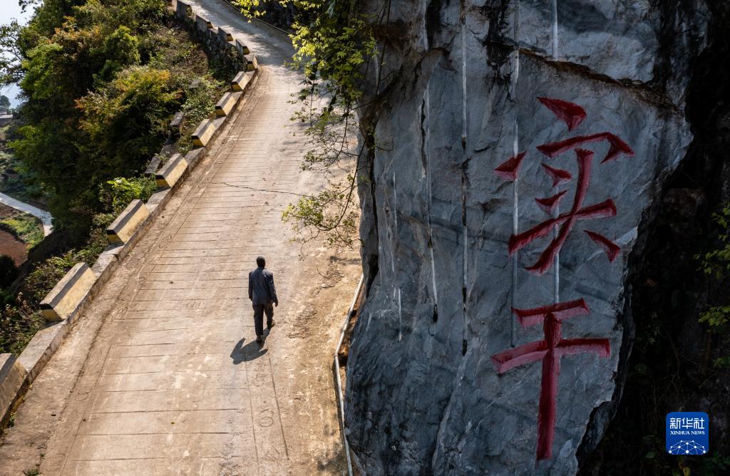 一條蜿蜒曲折的水泥路掛在山崖間、沖出亂石堆,還劈開一塊十幾米高的巨石,在巖壁上留下刷著紅漆的兩個大字——“實干”。