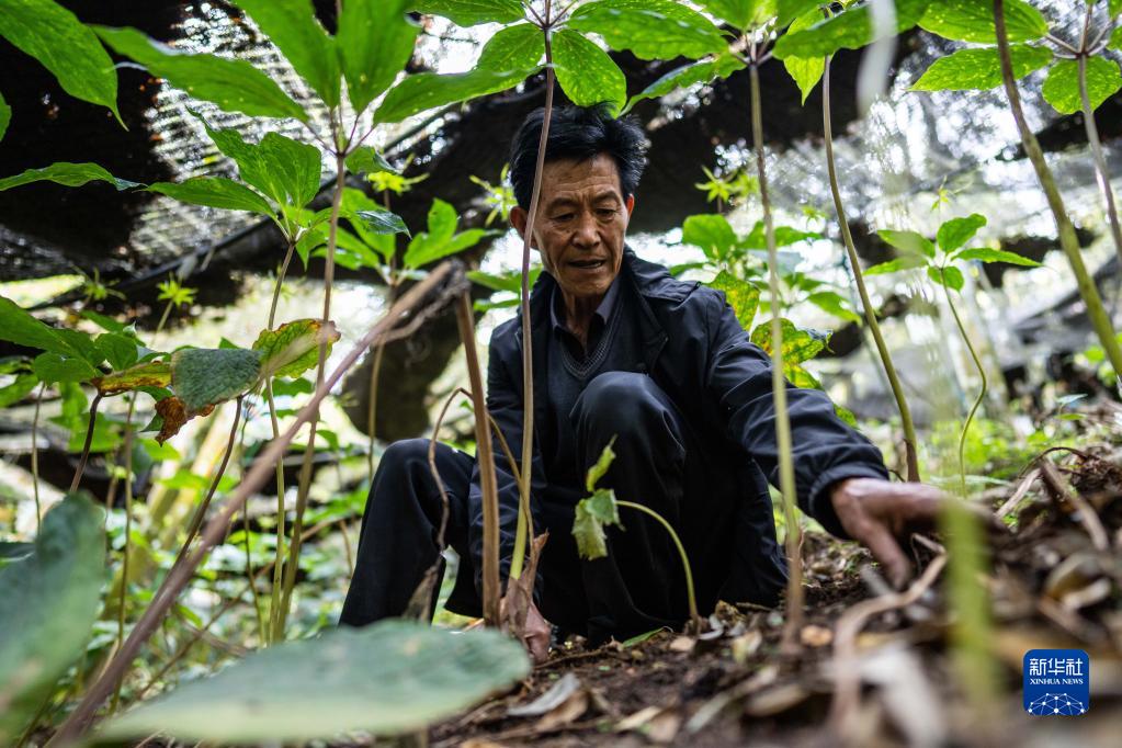 在云南西疇縣西灑鎮,程敦儒在中藥材基地勞作(3月27日攝)。新華社記者江文耀攝