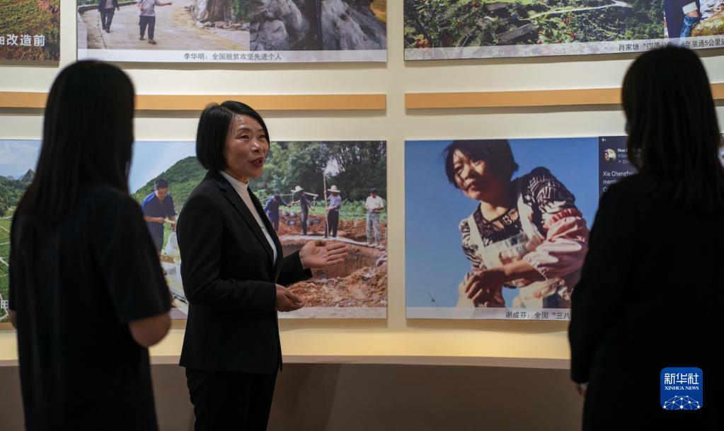 謝成芬在西疇縣“西疇精神”展覽館里講述治理石漠的故事(3月26日攝)。新華社記者江文耀攝