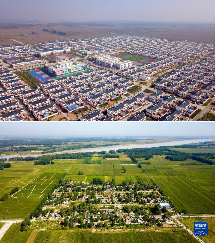 拼版照片的上圖為山東省菏澤市鄄城縣舊城鎮安置王莊村等灘區群眾的六合社區(2021年10月13日攝,無人機照片);下圖為遷建之前的菏澤市鄄城縣舊城鎮王莊村舊址,現已復墾(2020年9月20日攝,無人機照片)。新華社記者 郭緒雷攝