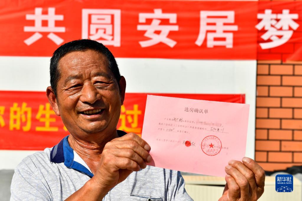 在山東省菏澤市鄄城縣舊城鎮六合社區,王莊村村民孫廣林在展示自己的選房確認單。當日,鄄城縣舊城鎮六合社區首批遷建安置村民按照排號順序,統一“選房”,準備喬遷新居(2020年9月20日攝)。新華社記者 郭緒雷攝