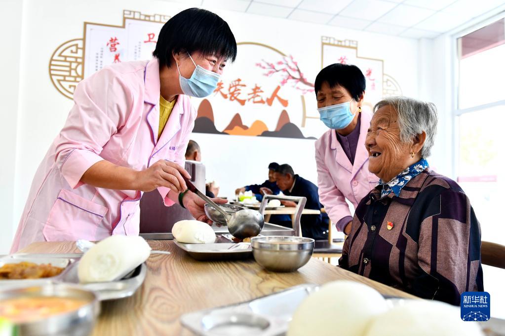 在山東省東營市墾利區楊廟社區養老服務中心,工作人員為老人準備午餐(2021年10月18日攝)。新華社記者 郭緒雷攝