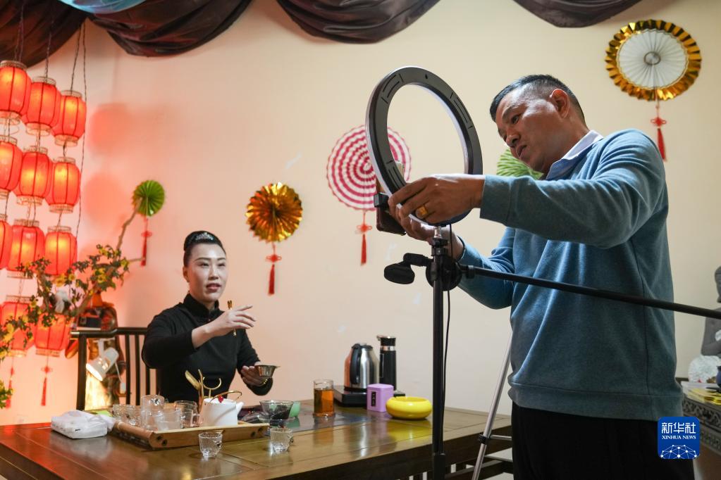 山東省濟南市長清區孝里街道居民馮辛華(右)、徐金玉夫婦在自己經營的茶葉店里準備直播(4月8日攝)。新華社記者朱崢攝