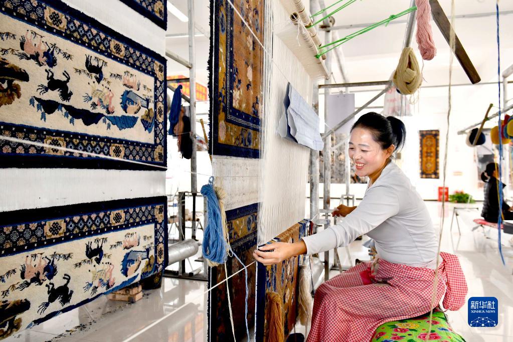 村民在山東省菏澤市鄄城縣六合社區鄉村振興創業車間加工地毯(2021年10月13日攝)。新華社記者 郭緒雷攝