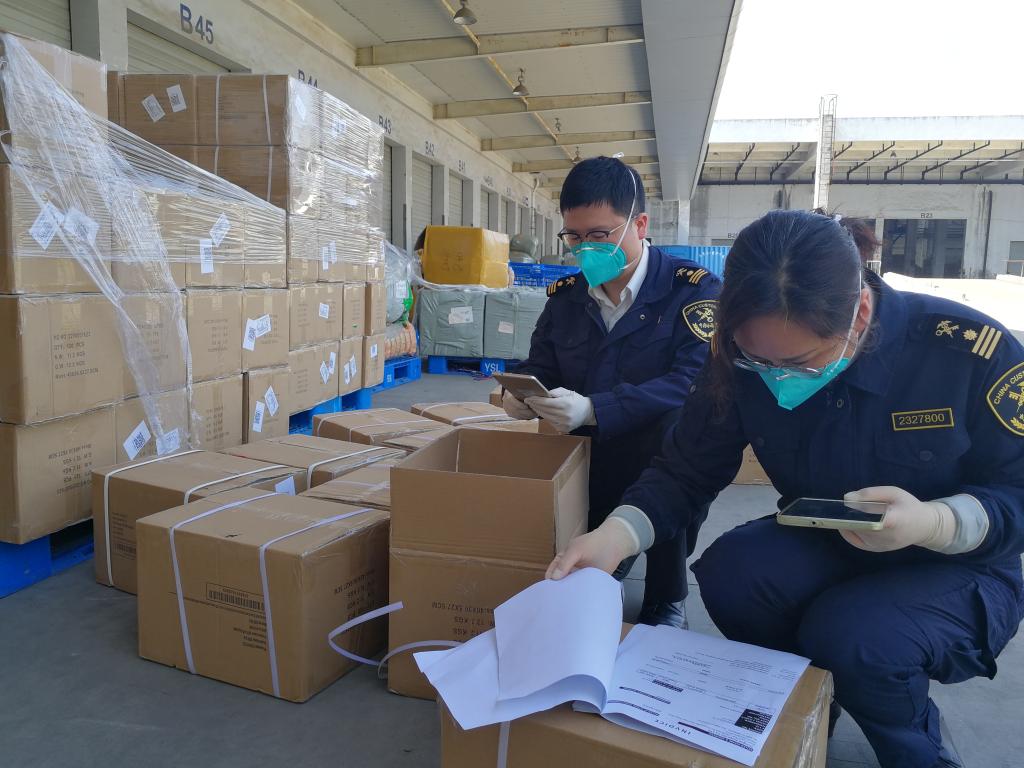 圖為海關工作人員查驗即將搭乘貨運包機出口的貨物。(受訪者供圖)