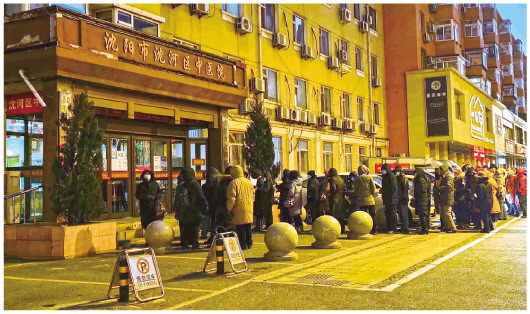 ▲2022年元旦假期后上班第一天,沈河區中醫院門前一大早就排起了長隊。 受訪者供圖