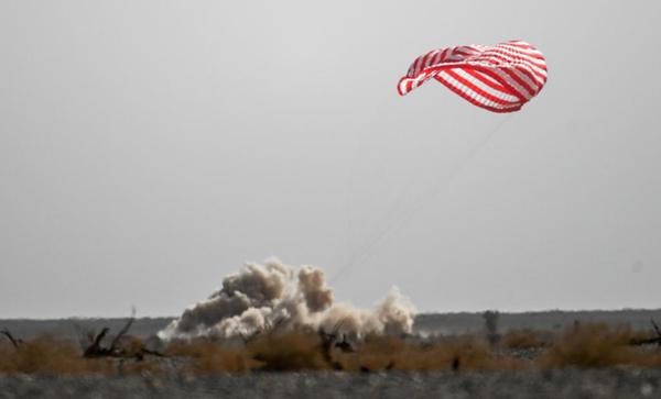2022年4月16日,神舟十三號載人飛船返回艙在東風著陸場預定區域成功著陸。新華社記者 連振 攝