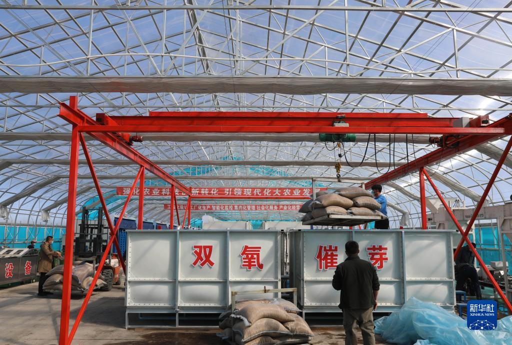 在北大荒集團洪河農場有限公司,工作人員用智能雙氧催芽技術對水稻種子催芽(4月1日攝)。新華社發