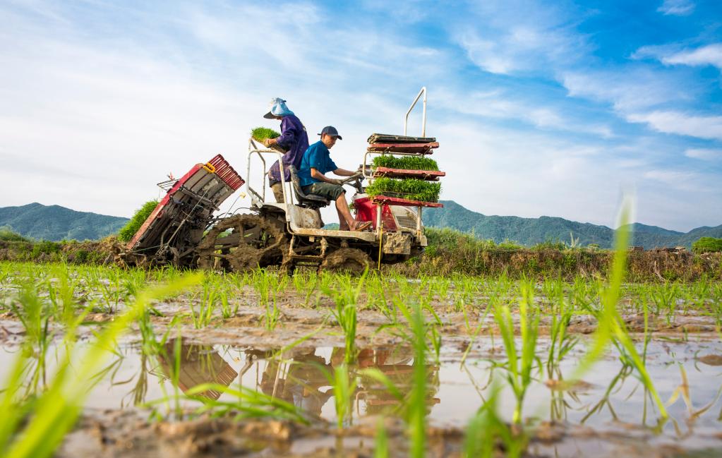 4月12日,江西省九江市都昌縣蔡嶺鎮楊灣村農民駕駛農機在田間勞作。新華社發(傅建斌 攝)