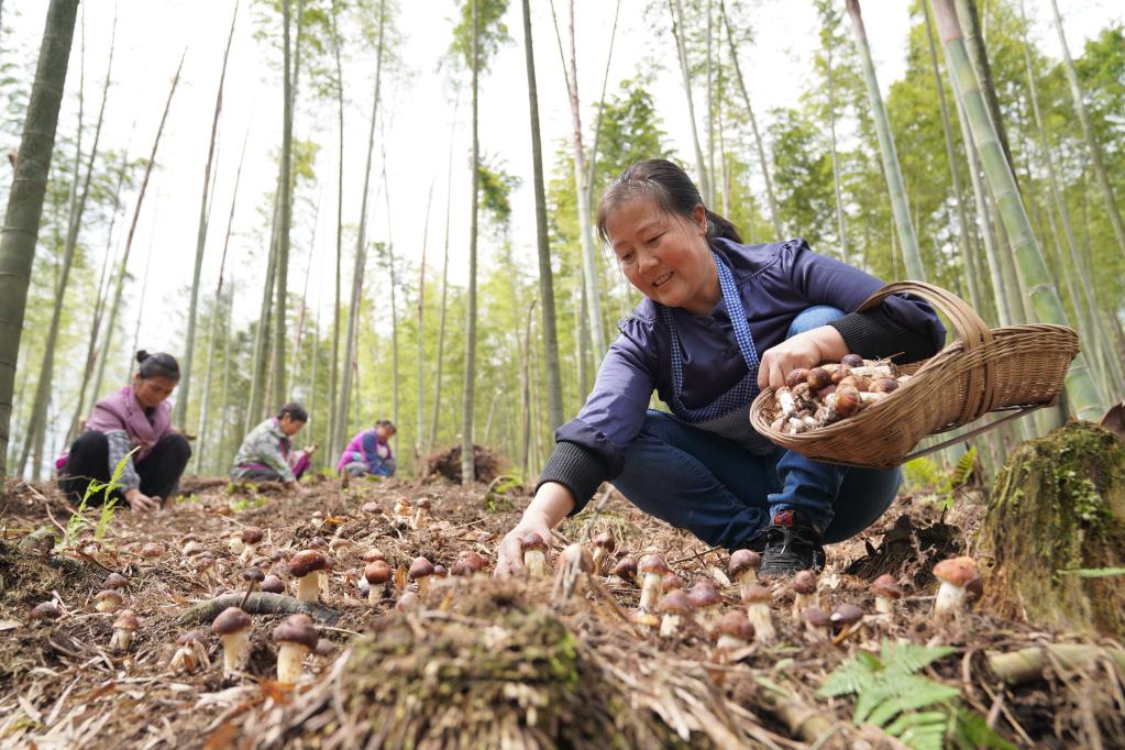 4月19日,農民在貴州省赤水市寶源鄉回龍村竹林間采收赤松茸。新華社發(張鵬 攝)