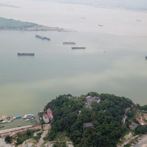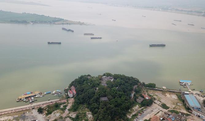 長江和鄱陽湖在江西省九江市湖口縣石鐘山附近交匯,形成江湖兩色美景(2018年8月5日無人機拍攝)。新華社記者金立旺攝