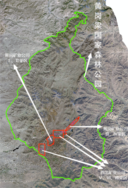 2022年4月2日,督察組調取衛片顯示,黃崗梁鐵礦區兩家企業7個采區全部位于黃崗梁國家森林公園內。督察組供圖
