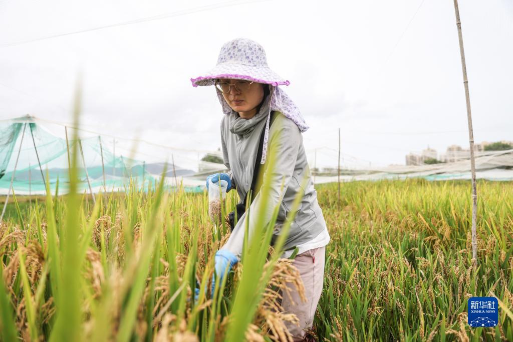 青島海水稻研究發展中心的工作人員在三亞南繁科研育種基地里收集水稻種子(3月31日攝)。新華社記者 張麗蕓 攝