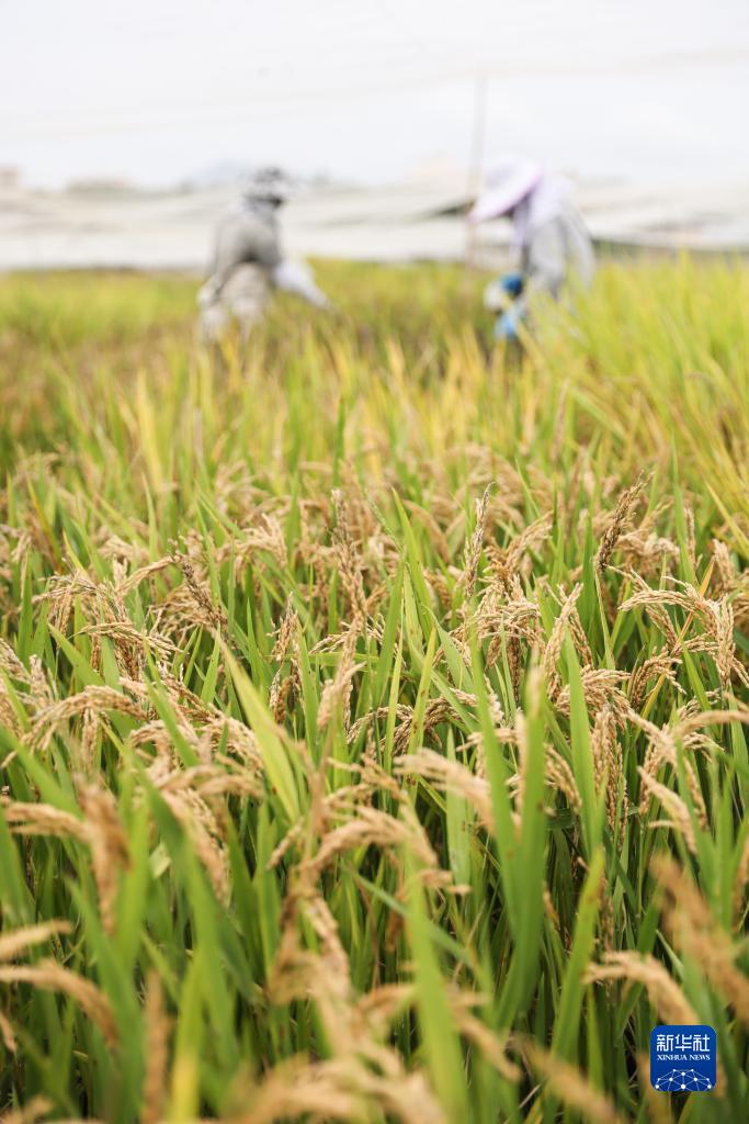 青島海水稻研究發展中心的工作人員在三亞南繁科研育種基地里收集水稻種子(4月1日攝)。新華社記者 張麗蕓 攝