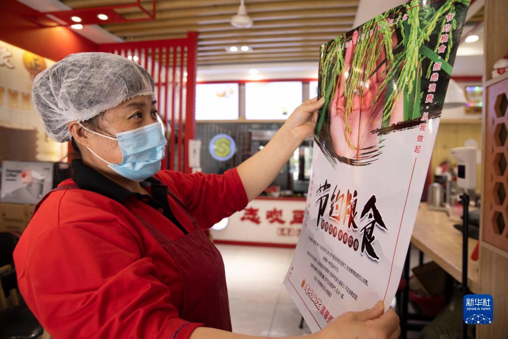 4月28日,在哈爾濱市道里區一家飯店,工作人員準備張貼節約糧食宣傳畫。新華社記者 張濤 攝