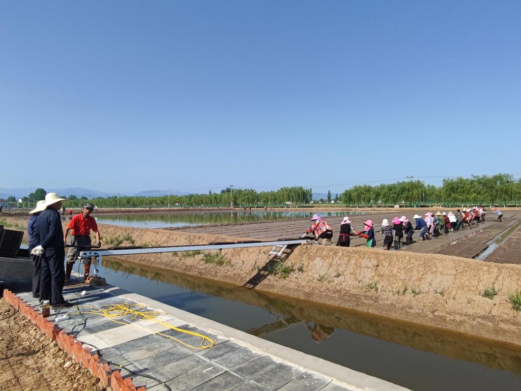 工人們在稻蝦(小龍蝦)綜合種養基地內進行傳統育秧。(城固縣委宣傳部供圖)