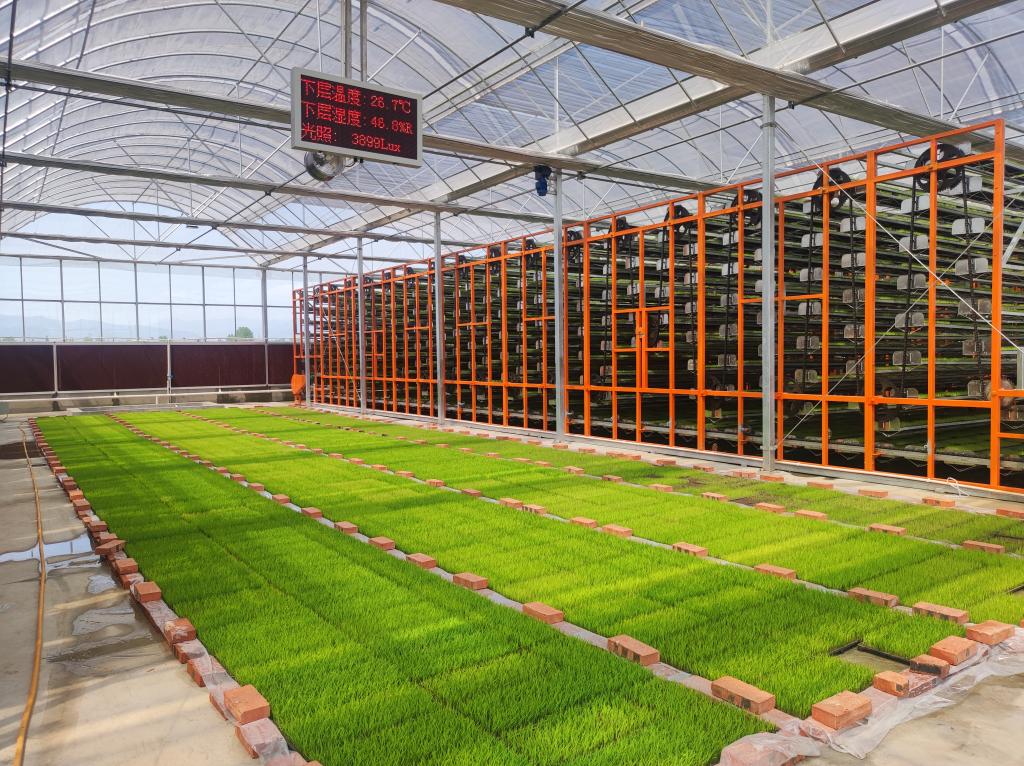 育秧中心中間的電子屏會實時顯示大棚里濕度、溫度、光照和二氧化碳指數。地上為傳統育秧方式,育秧架為現代育秧方式。 (城固縣委宣傳部供圖)