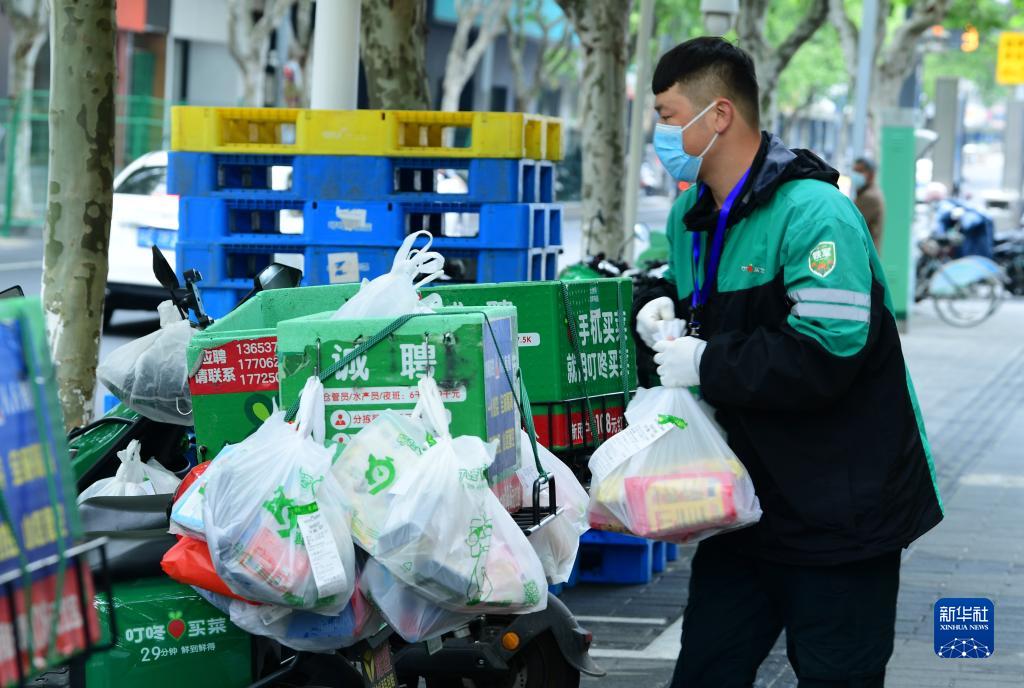 4月30日,在江蘇省太倉市一家生鮮電商配送點,配送小哥在整理當天準備配送的生鮮訂單。新華社發(計海新 攝)