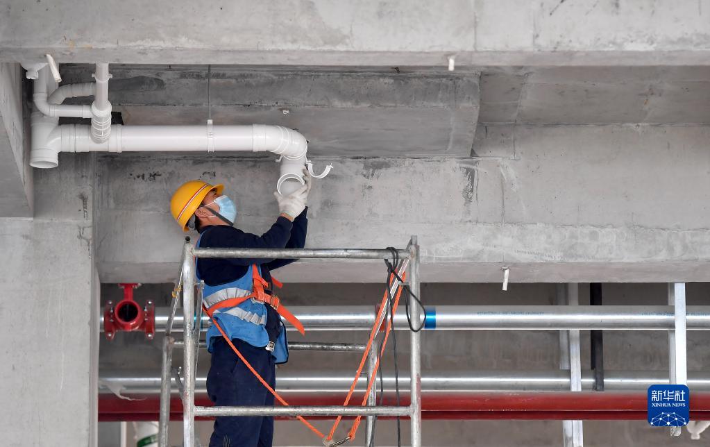 5月1日,中建二局陜西分公司的工人在陜西國際商貿學院項目工地施工。新華社記者 劉瀟 攝