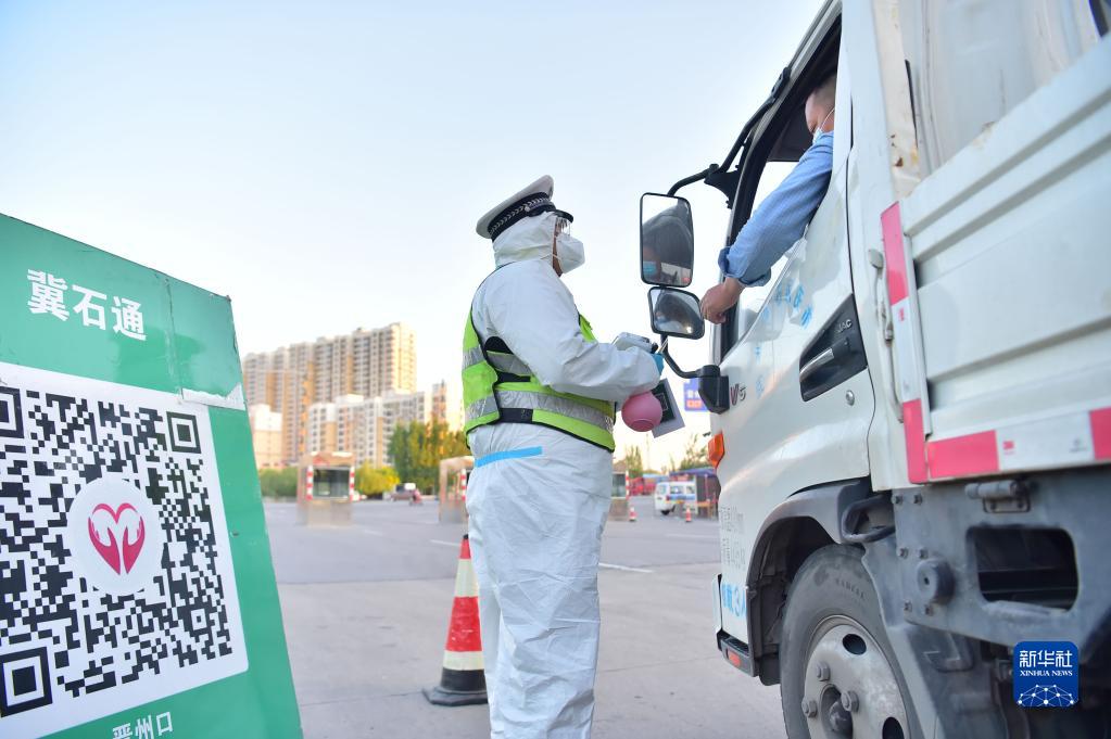 5月1日,在石家莊石黃高速晉州站口,交警對出站車輛進行檢查。新華社發(張曉峰 攝)