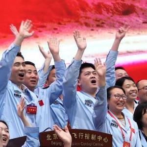 航天科研人員在北京航天飛行控制中心指揮大廳慶祝我國首次火星探測任務著陸火星成功(2021年5月15日攝)。新華社記者 金立旺 攝