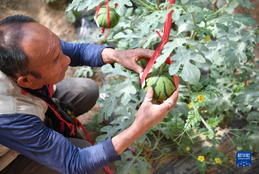 延安市延川縣關莊鎮二八甲村村民在大棚內查看西瓜的“生日卡”(3月31日攝)。新華社記者 邵瑞 攝