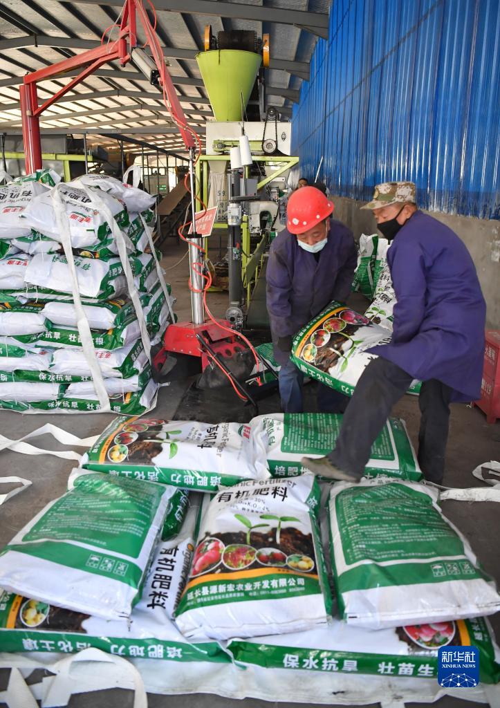 在延安市延長縣現代循環農業示范園一家企業車間內,工人在搬運有機肥料(4月1日攝)。新華社記者 邵瑞 攝