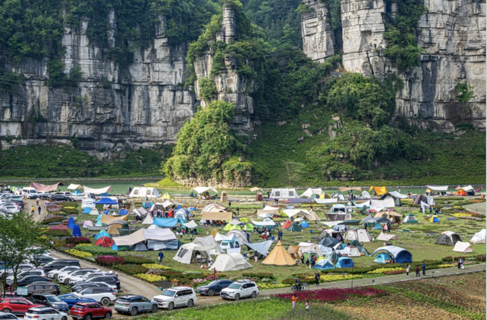 5月2日,人們在重慶市南川區萬卷書臺景區露營游玩。新華社發(瞿明斌攝)