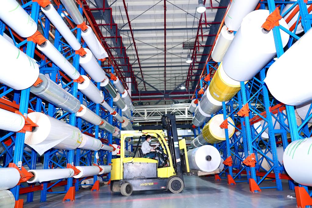 艾利丹尼森(中國)有限公司車間里,工人正在裝卸產品。(昆山市融媒體中心供圖)