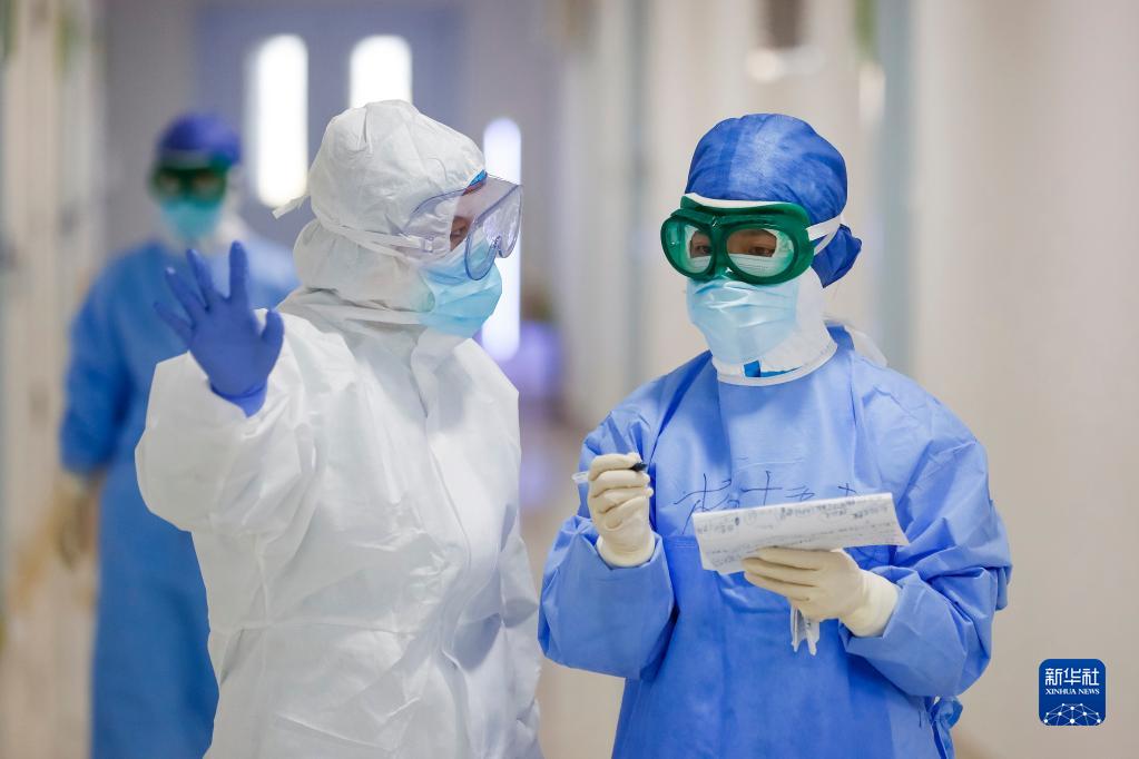在武漢市金銀潭醫院的一個病區,金銀潭醫院護士與浙江省人民醫院護士(右)交接工作(2020年3月18日攝)。新華社記者 沈伯韓 攝