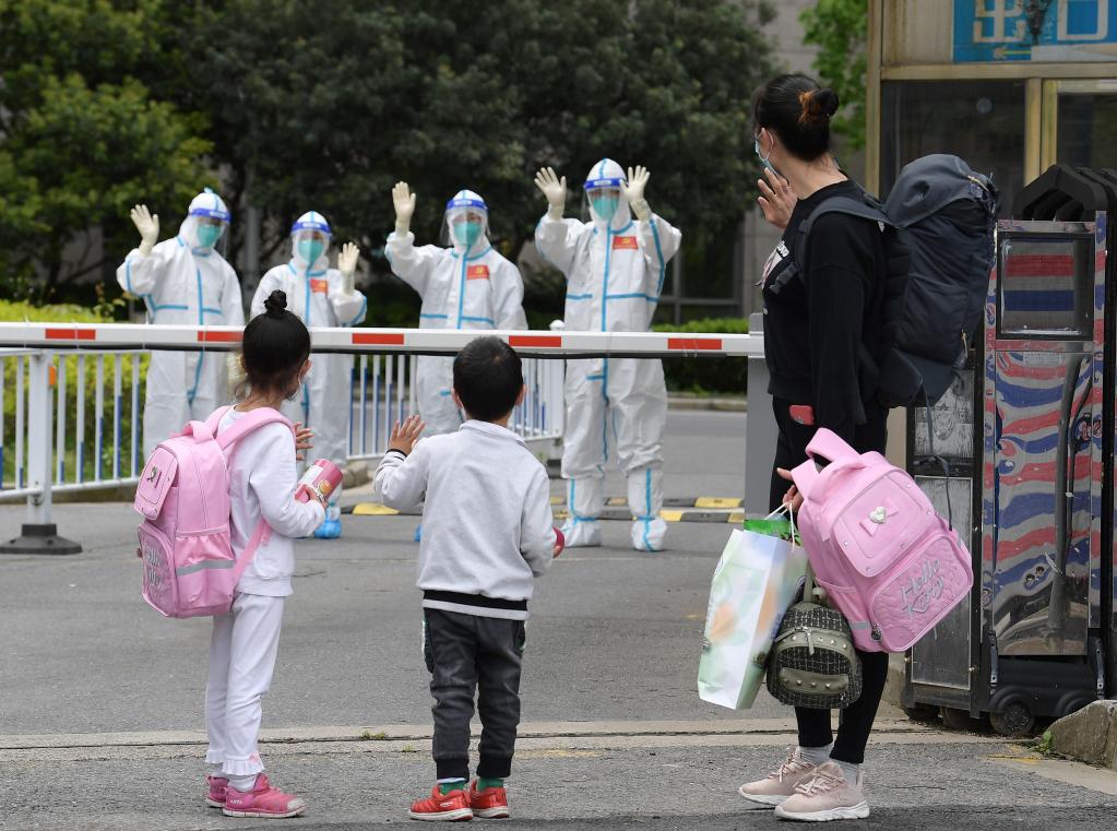 4月30日,由上海交通大學醫學院附屬仁濟醫院南部院區收治的3歲重癥新冠患者小華(化名)出院。走出醫院準備回家時,小華(前中)和姐姐、媽媽(右一)一起回身向醫護人員道別。新華社記者李賀 攝