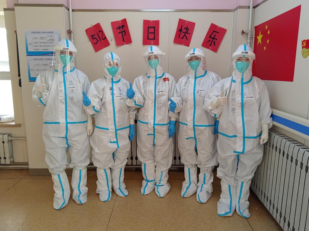 吉林大學第一醫院卒中中心副護士長鄧秋霞(左三)和醫護人員在長春市傳染病醫院支援。(受訪者供圖)