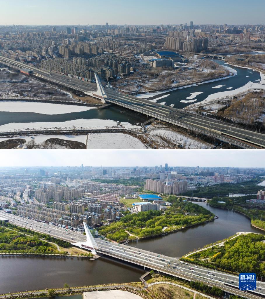 拼版照片:上圖為3月20日拍攝的長春市城區景象(無人機照片,新華社發);下圖為5月11日拍攝的長春市城區景象(無人機照片,新華社記者許暢攝)。新華社發