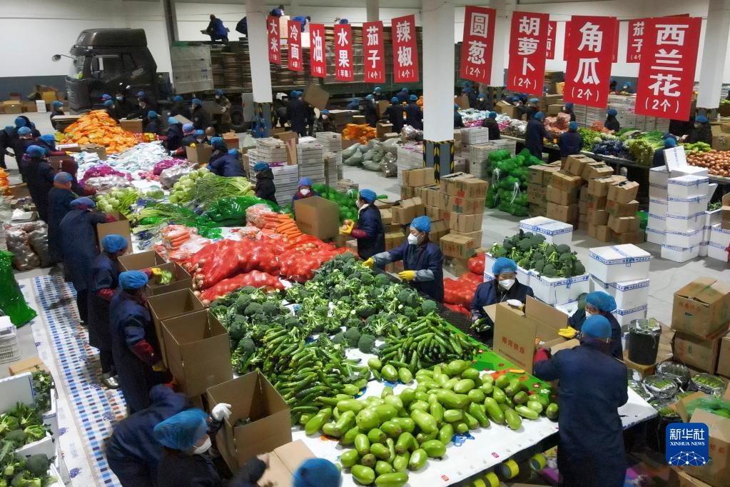 梅河口市工作人員進行“蔬菜包”菜品分揀(4月7日攝,無人機照片)。新華社發