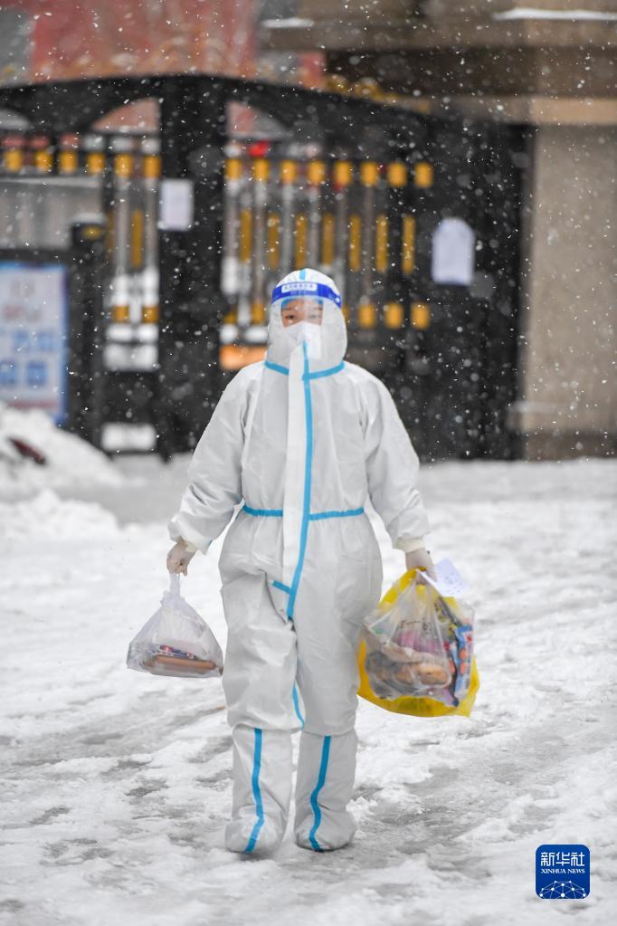 3月15日,吉林省吉林市昌邑區興華街道中興社區網格員為隔離居民運送生活物資。新華社記者 張楠 攝