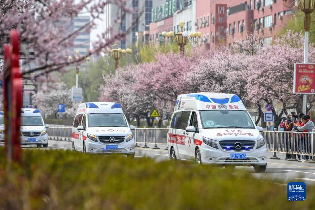 4月20日,遼寧省援助吉林市救護車隊完成疫情防控任務返程,行駛在吉林市吉林大街。新華社記者 張楠 攝