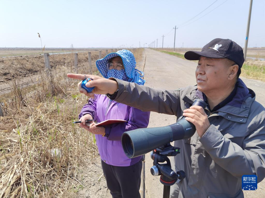 4月29日,盤錦市林業和濕地保護服務中心主任李玉祥(右)和同事在觀察黑嘴鷗數量。新華社發