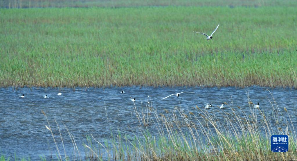5月5日在盤錦市遼河口濕地南小河黑嘴鷗繁殖區拍攝的黑嘴鷗。新華社記者 楊青 攝
