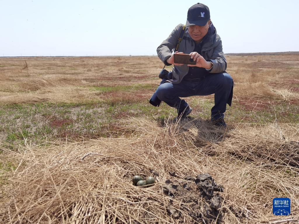 4月29日,盤錦市林業和濕地保護服務中心主任李玉祥在查看黑嘴鷗孵蛋情況。新華社發