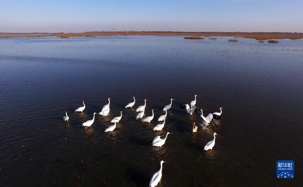這是在遼寧省法庫縣獾子洞濕地拍攝的白鶴(2018年10月24日攝,無人機照片)。新華社記者 楊青 攝