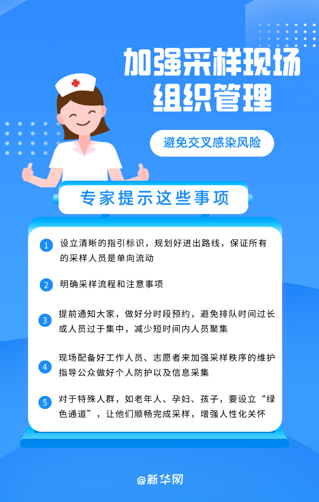 采樣現場大家排隊做核酸,如何避免交叉感染風險?郭燕紅對于加強采樣現場組織管理方面,給出以下提示: