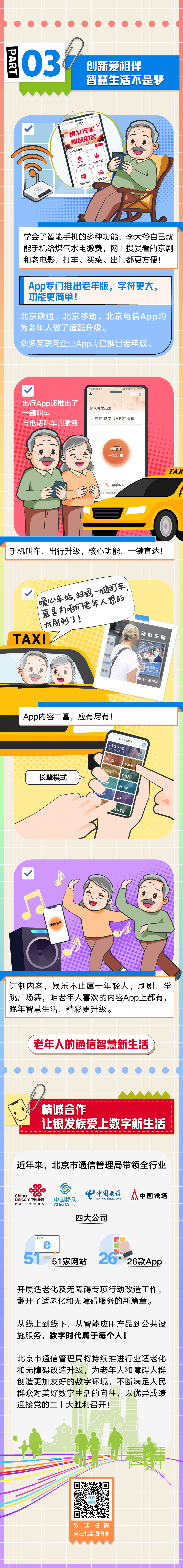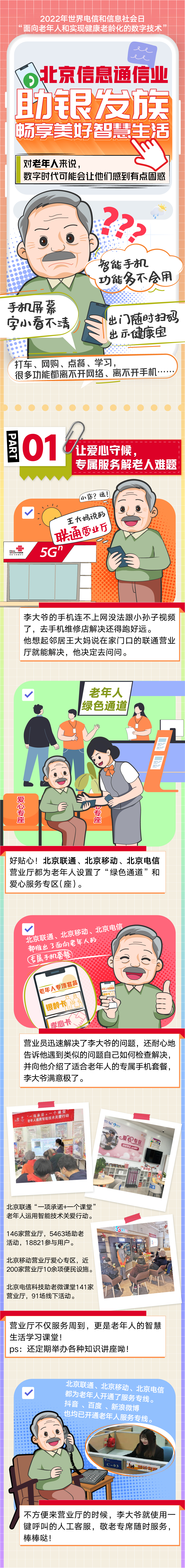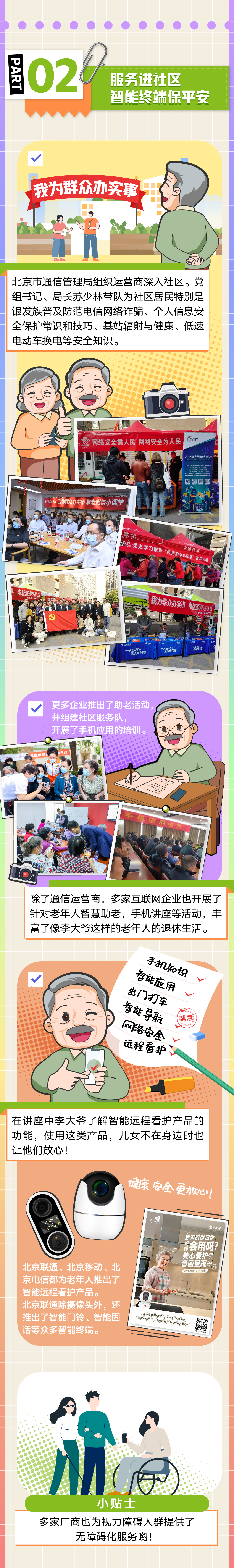 不僅如此,越來越多針對老年人的暖心智能服務出現在我們身邊。今年1月,北京移動推出了10086視頻客服功能,可以通過視頻的方式為老年人‘面對面’‘手把手’提供服務;北京聯通推出銀齡卡、孝心卡讓老年人與數字生活接軌,遠在異鄉的兒女,通過“異地同享”“聯通看家”等可以隨時關注老人;北京電信為老年人開設助老“微課堂”,教老年人學會使用智能手機應用,同時聯手國家統計局老年大學進行反詐知識科普,讓老年人守護好自身“錢袋子”……