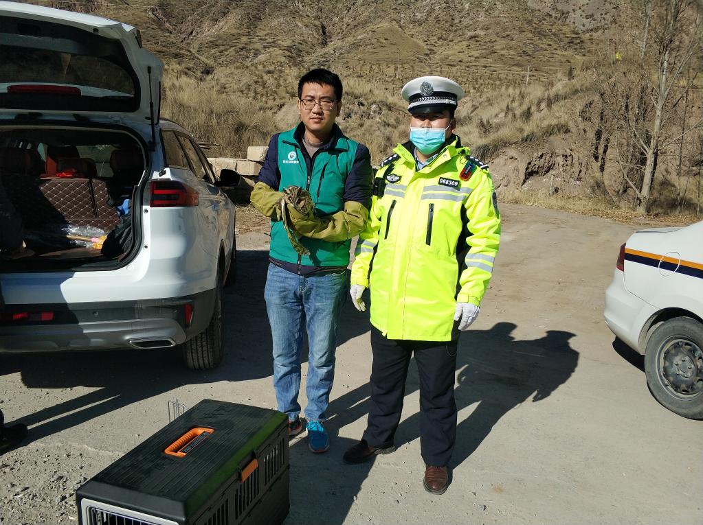 王博(左)趕往現場接回受傷的野生動物。(受訪者供圖)