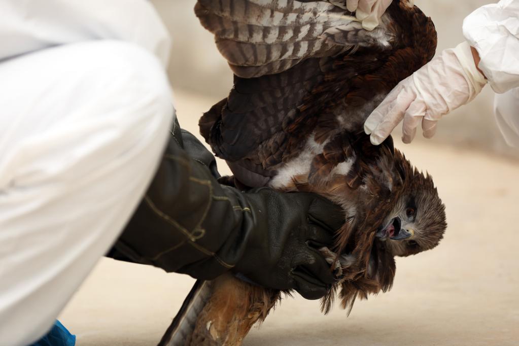 王紅軍和同事為救助來的黑耳鳶檢查身體。新華社記者郭剛 攝