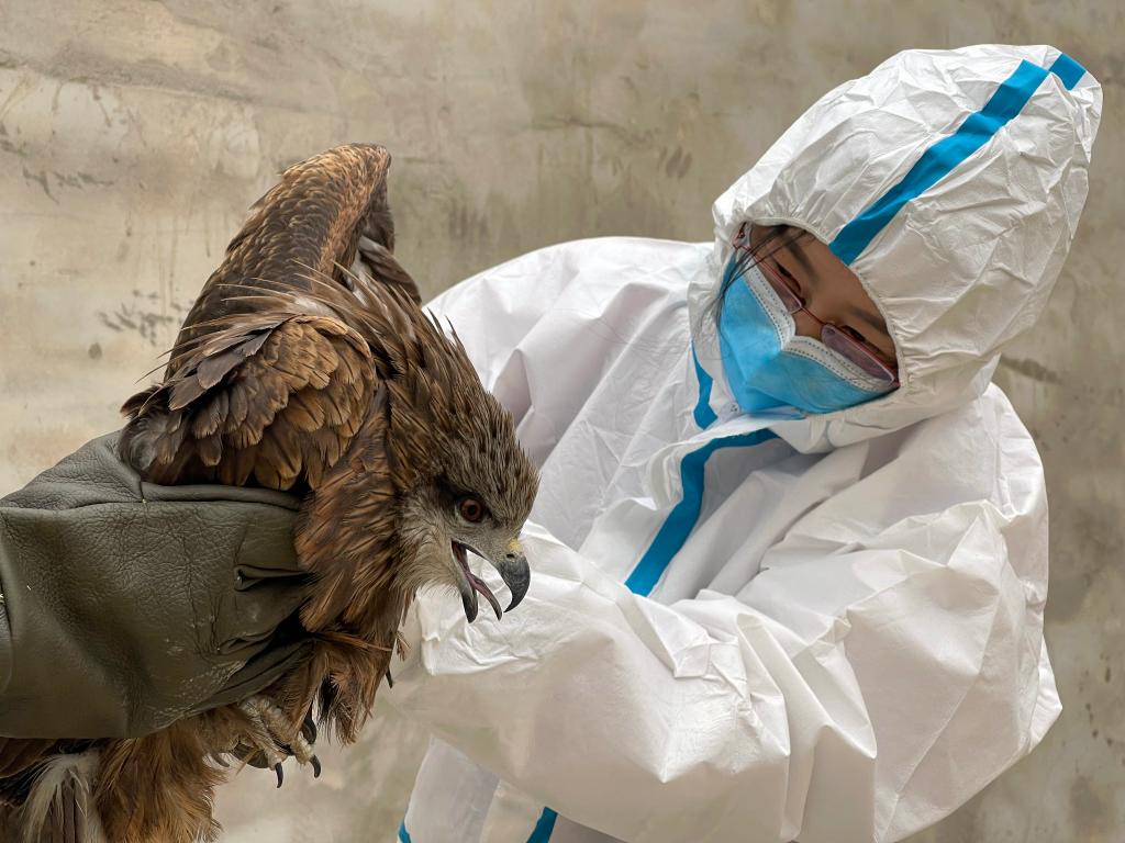 工作人員對黑耳鳶進行救治。新華社記者郭剛 攝
