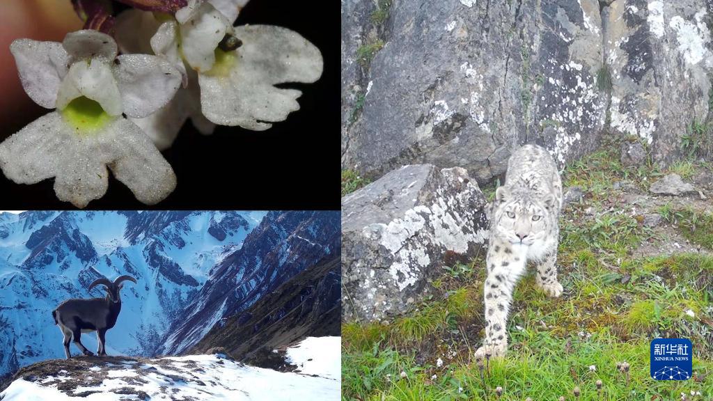 這是一張拼版照片:2020年工作人員在大熊貓國家公園臥龍片區發現了蘭科植物新種臥龍無柱蘭(左上);2021年1月22日,大熊貓國家公園王朗片區野外紅外相機拍攝到的巖羊(左下);2021年8月19日,大熊貓國家公園王朗片區野外紅外相機拍攝到的雪豹(右)。新華社發