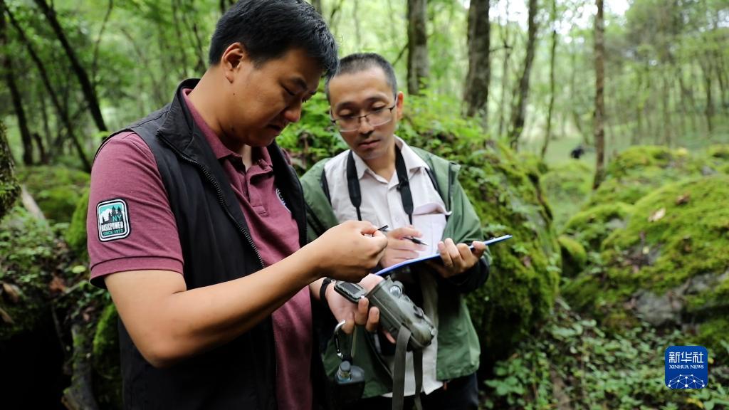 工作人員在大熊貓國家公園唐家河片區內更換野外紅外相機電池及儲存卡(資料照片)。新華社發