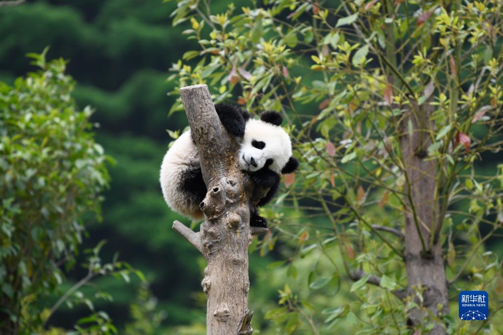 在中國大熊貓保護研究中心臥龍神樹坪基地內,一只大熊貓在樹上休息(4月24日攝)。新華社記者 胥冰潔 攝