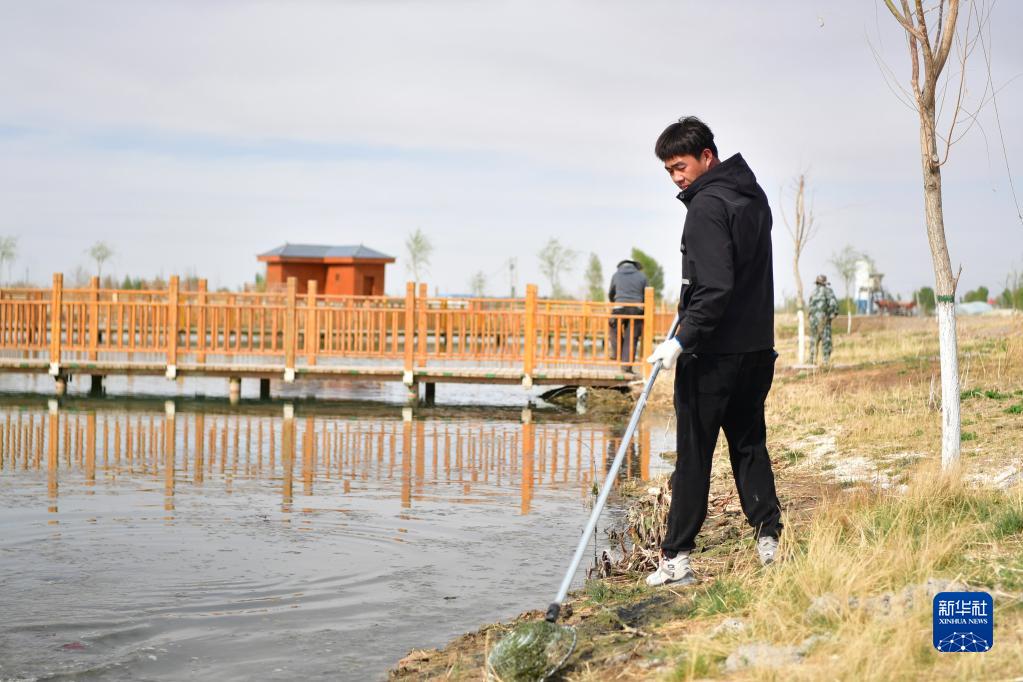 村民在甘肅省張掖市臨澤縣鴨暖鎮白寨村的湖邊清理環境(4月14日攝)。新華社記者 陳斌 攝
